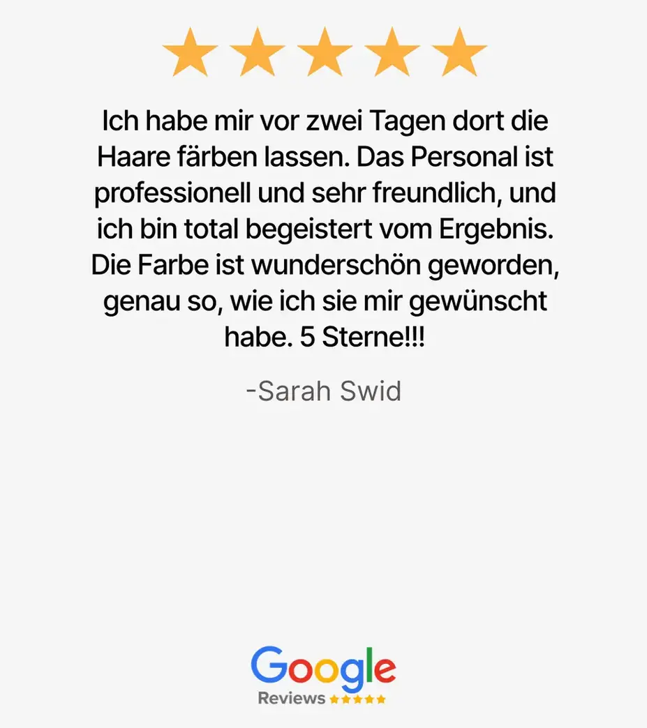 Nach zwei Jahren Suche habe ich endlich den perfekten Friseur gefunden! Sie haben mir zugehört, mich verstanden und genau das umgesetzt, was ich wollte. Die Farbe ist wunderschön geworden und der Schnitt fantastisch! Sie haben meine Haare gestylt und mir alles über Pflege- und Stylingprodukte erklärt. Das ist kein gewöhnlicher Salon, sondern ein Ort zum Wohlfühlen und Entspannen! Der beste Friseur in Frankfurt – 100 %!