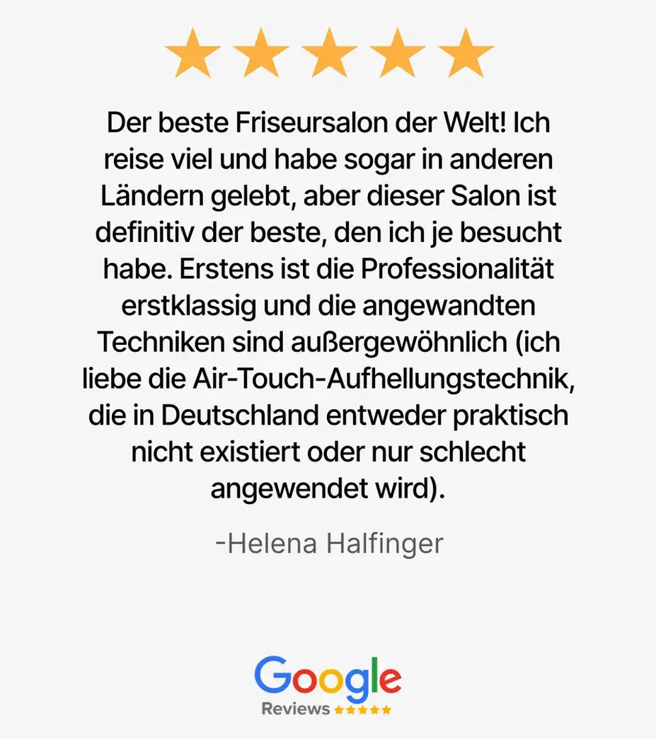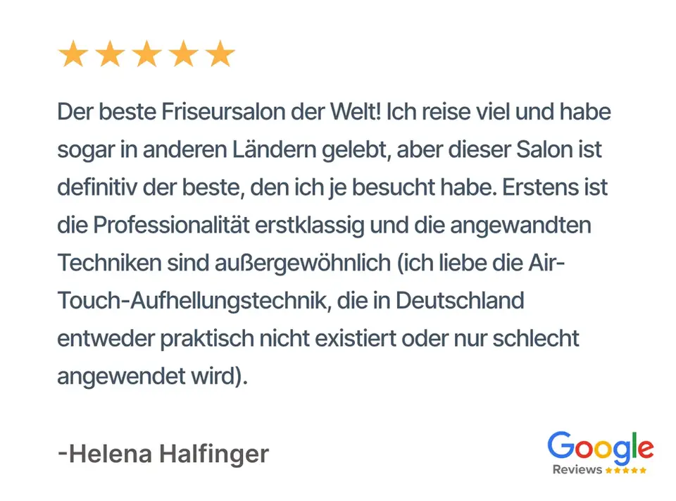 Der beste Friseursalon der Welt! Ich reise viel und habe sogar in anderen Ländern gelebt, aber dieser Salon ist definitiv der beste, den ich je besucht habe. Erstens ist die Professionalität erstklassig und die angewandten Techniken sind außergewöhnlich (ich liebe die Air-Touch-Aufhellungstechnik, die in Deutschland entweder praktisch nicht existiert oder nur schlecht angewendet wird).
